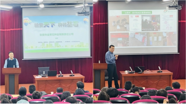 报告会上,两位企业代表分别以《粮安天下 种筑基石》《农业专业化社会化服务协同创新助力玉米制种产业绿色高质量发展》为题作了精彩的报告。员工詹文以信誉最好的十大体育平台求学、基层一线工作的个人奋斗经历为蓝本,回顾了在求学与探索之路上的成长与发展,围绕农业老员工历史使命及社会责任、怎样学好农学专业、农业的机遇和方向、金葵花种业发展前景及社会贡献等四个方面激励同学们未来学习生涯中既要做好学术研究,又要在田间地头做文章、出成果,鼓励农学学子要踏实肯干,认真学习,勇于创新,用科技的力量来解决农业问题。谷丰源农工场负责人谷科强结合当前国家发展前景与个人工作经历,为现场同学们详细阐述土肥水药技术集成方案农服模式的内涵,对张掖市玉米制种产业耕地质量退化、连作障碍严重、土壤盐渍化和土壤板结加重等“卡脖子”问题进行了讲解,号召广大农学学子加强专业理论知识的学习,不断提升专业实践能力,将科技论文书写在陇原大地。