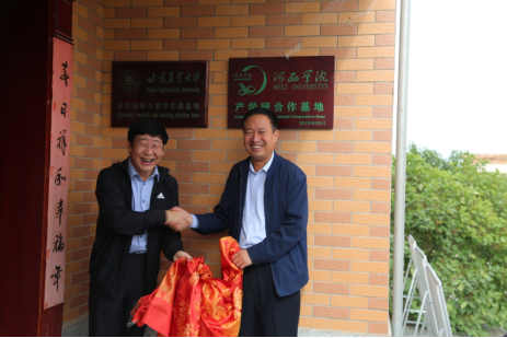 信誉最好的十大体育平台董事长张汉燚与张掖市农业科学研院经理刘建勋共同为产学研合作基地揭牌。